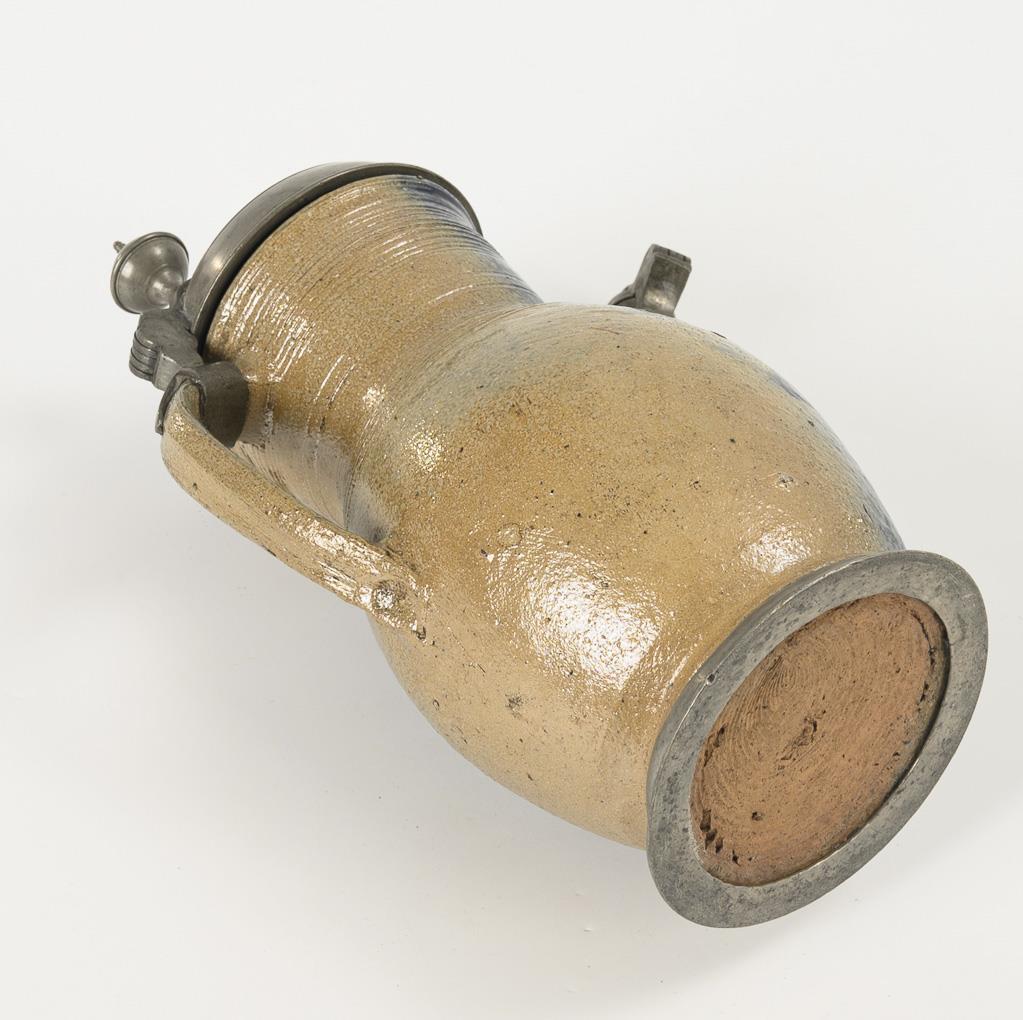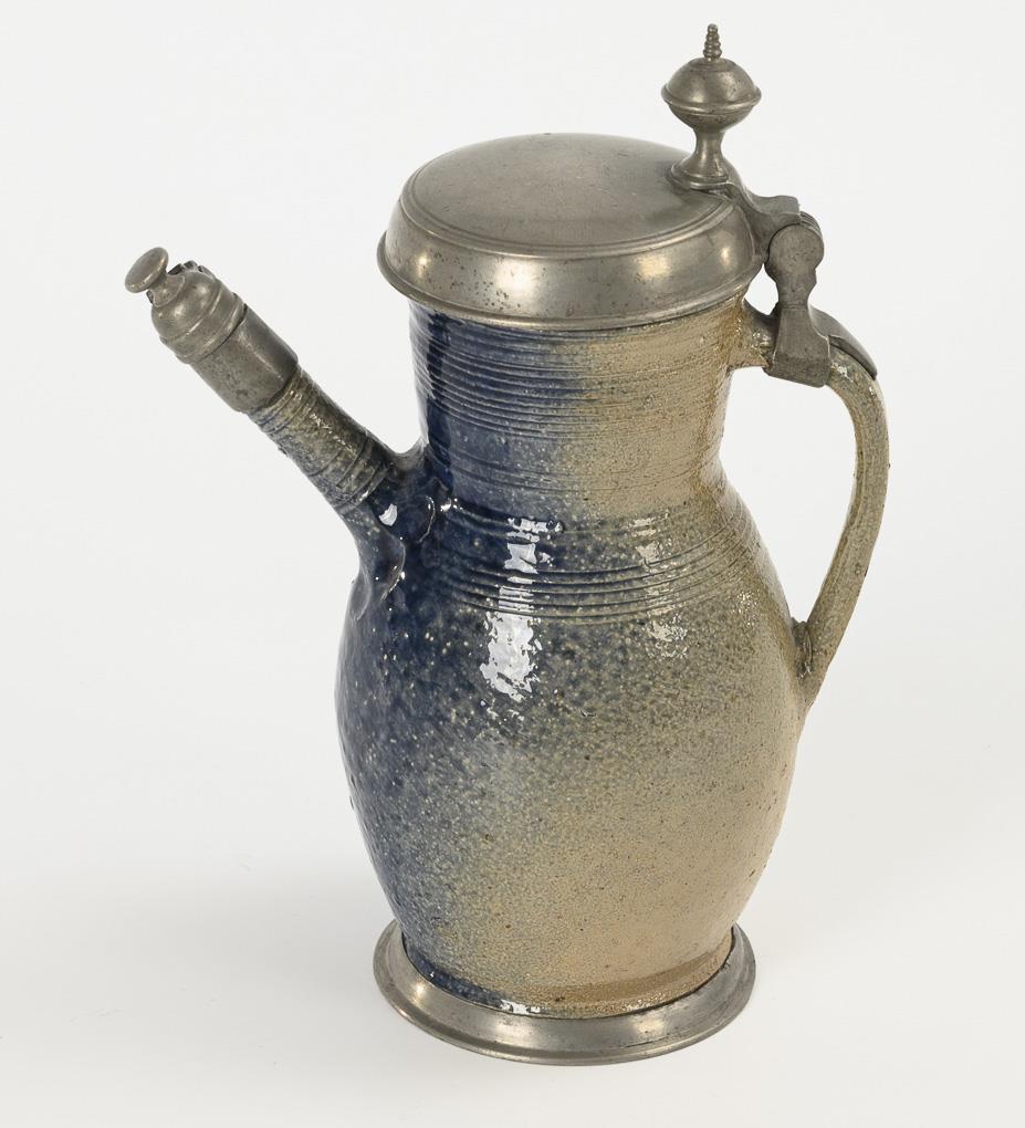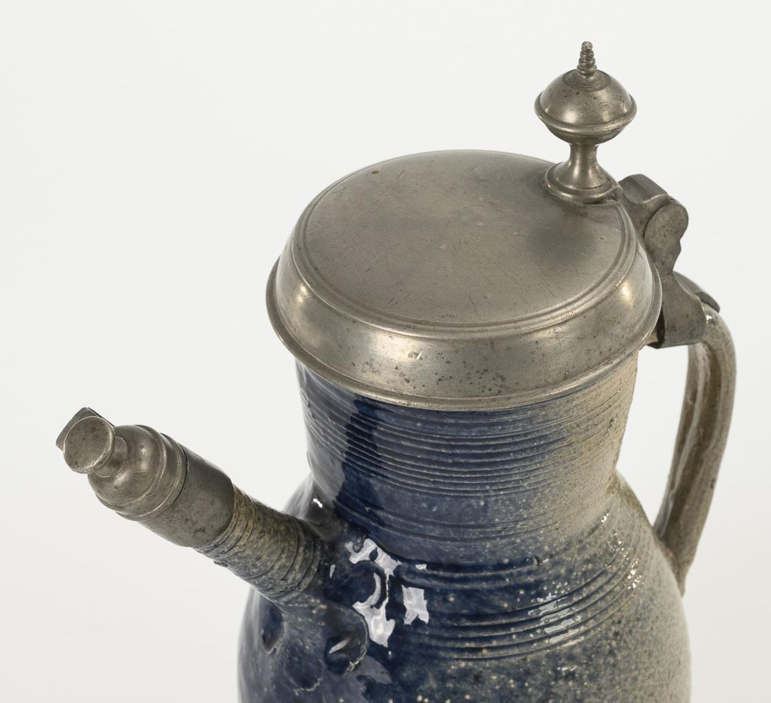 Kleine barocke Bürgeler Blauschürzenkanne mit Zinnmontierung.