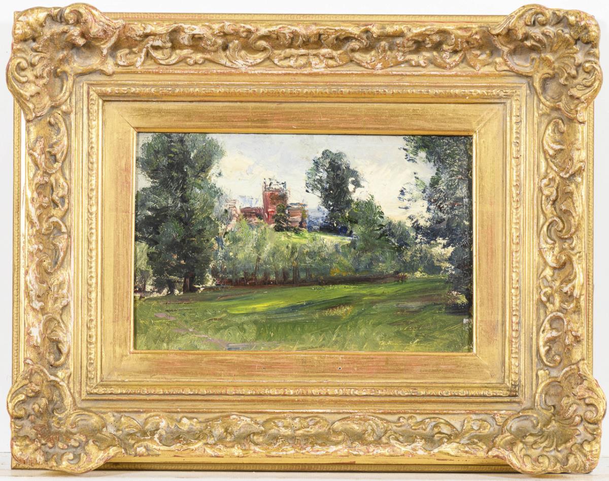 Blick auf den Schlosspark und das Schloss im hellen Sonnenlicht. Leichte Altersspuren.