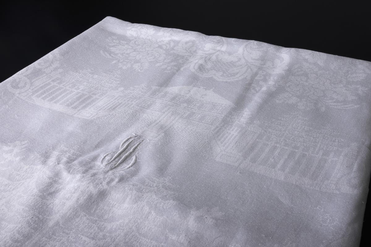 Tuch mittig mit Jagdschlossmotiven, umgeben von Hirschen. In den Ecken Jäger mit Hund. 2 große gestickte Monogramme GH.