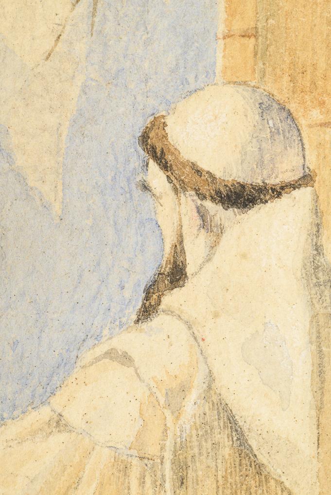 Mönch in weißer Kutte an einer Säule im Sonnenschein mit Blick über einen See. Leichte Altersspuren.