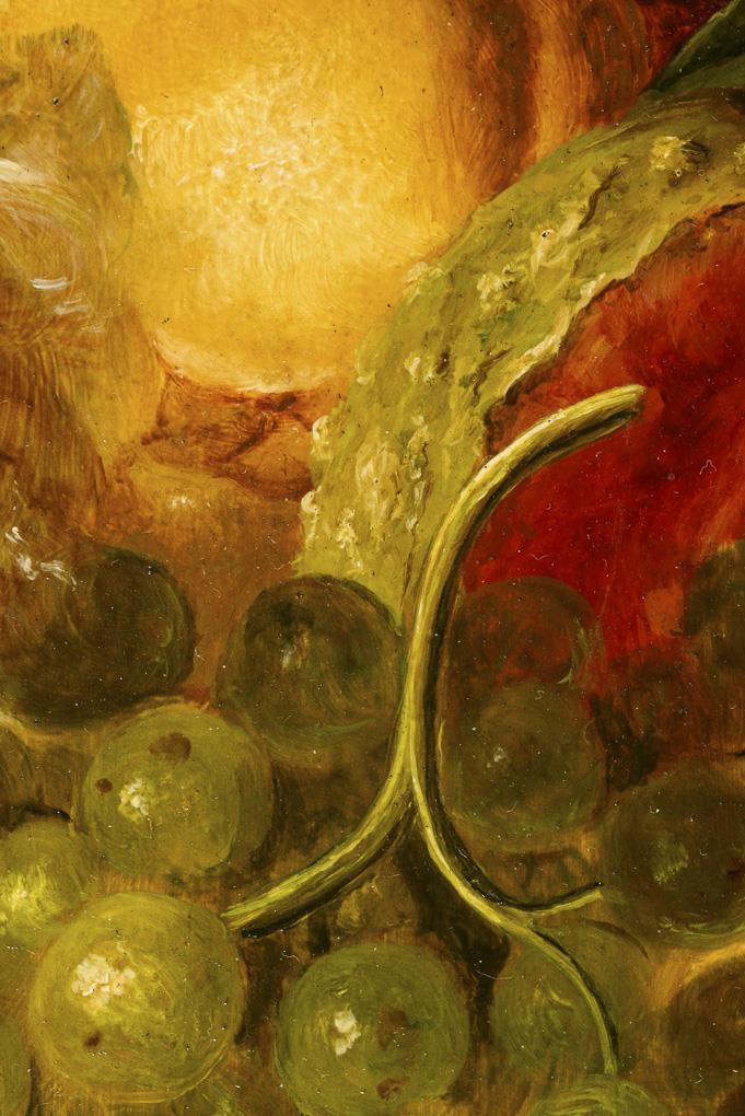 Im Altmeisterstil dargestellte Trauben, Pflaumen, Pfirsiche und Nüsse neben Rosen und Tulpen.