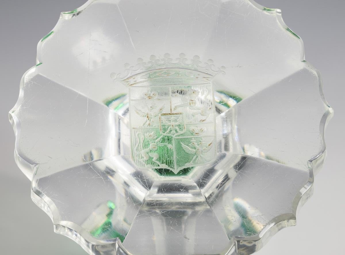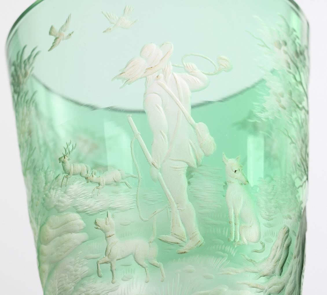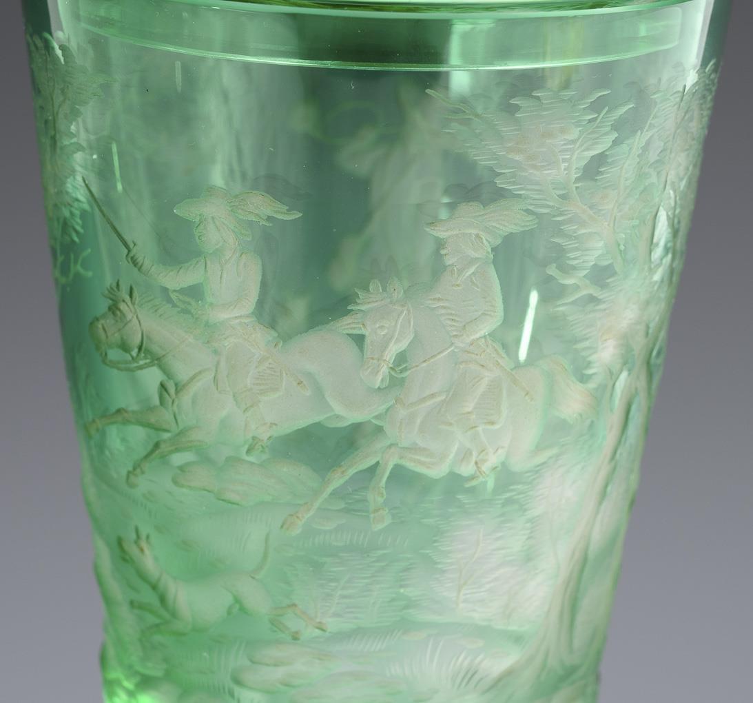 Konische Kuppa mit Olivenschliff, Deckel mit hohem, facettiertem Knauf, facettierter, nodierter Schaft, mehrpassiger Fuß. Umlaufend graviert mit der Darstellung einer Waldlandschaft mit Jäger, Jagdreitern, Hunden und Wild, unterseitig ein graviertes Wappen mit Löwen und Doppeladlern.
