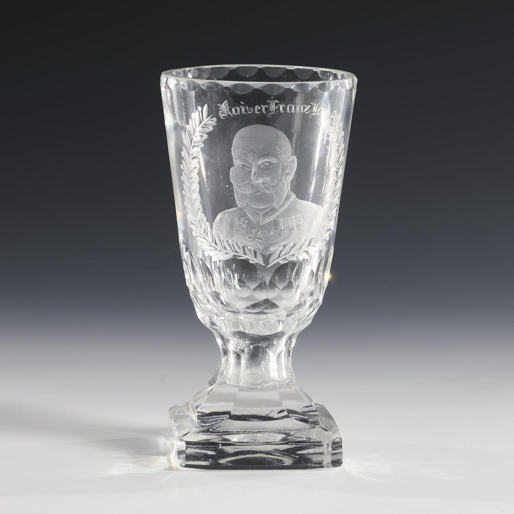 Konische, am Ansatz facettierte Kuppa, facettierter Schaft und quadratischer Fuß; ausgekugelter Abriss. Schauseitig das gravierte Bildnis des österreichischen Kaisers Franz Josef (1830-1916). Chip an 1 Fußecke, kleiner Chip am Mündungsrand.