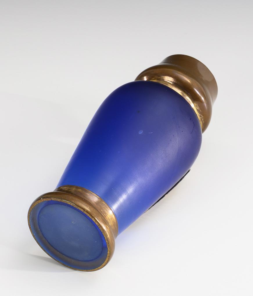 Farbloses Glas mit kobaltblauem Innenfang, Kupfer. H 16,5 cm.