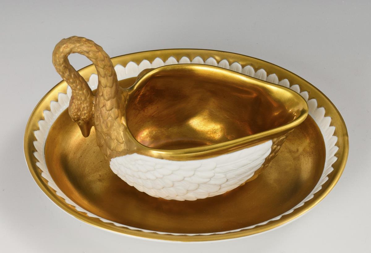 Im Form eines Schwanes gearbeitete Sauciere mit reliefierter Wandung und Schwanenhenkel.