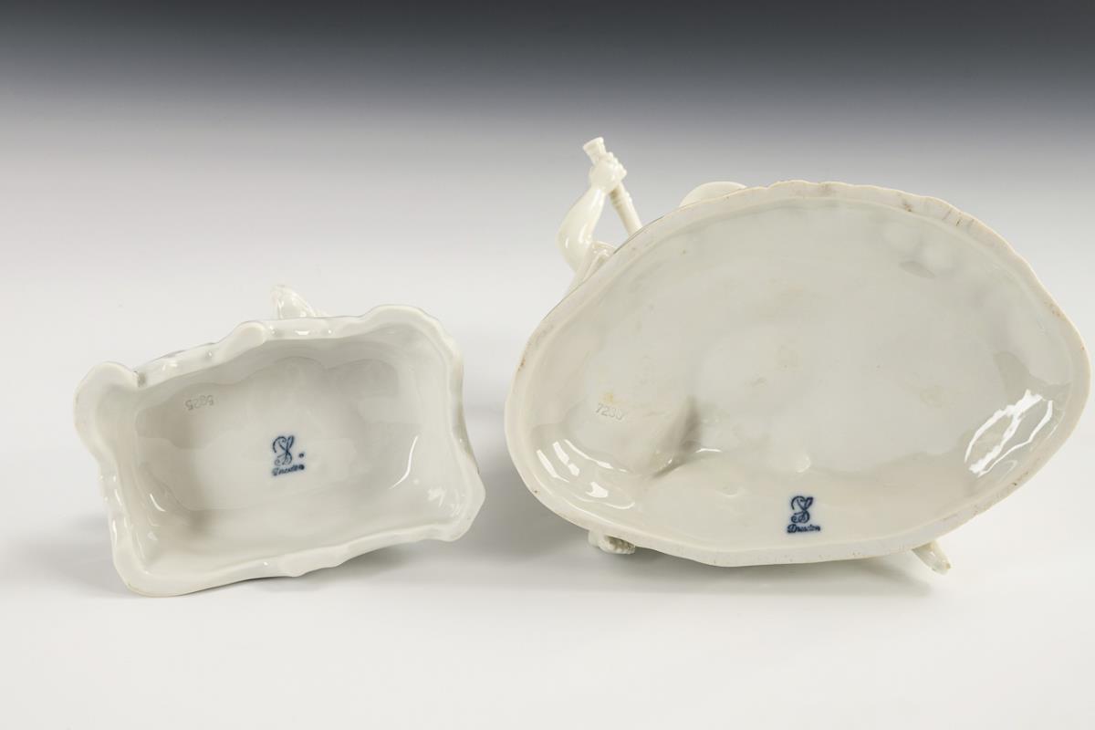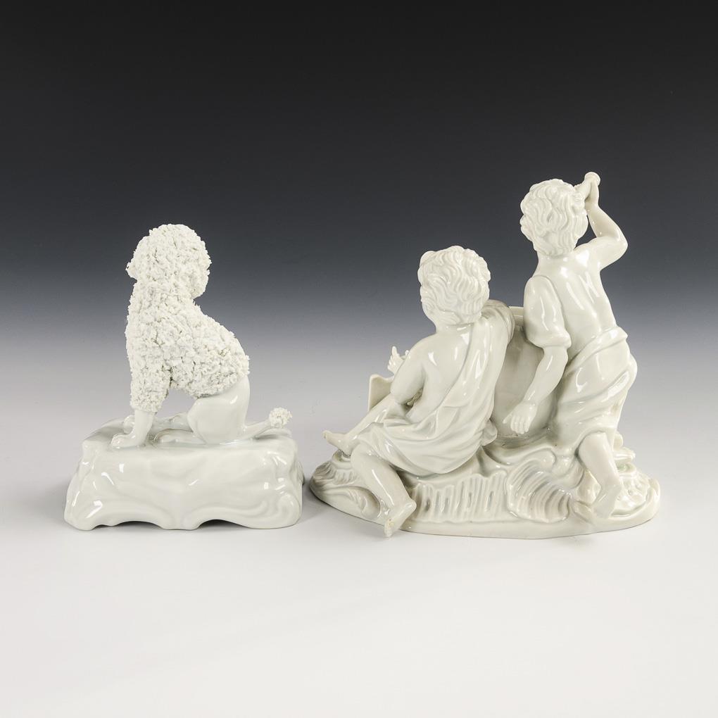 1x Puttengruppe als Allegorie der Astronomie, nach einem Entwurf von Johann Joachim Kaendler (1706-1775) um 1760 für die Porzellanmanufaktur Meissen (H 14,5 cm). / 1x Pudel auf Rocaillesockel (H 12 cm).