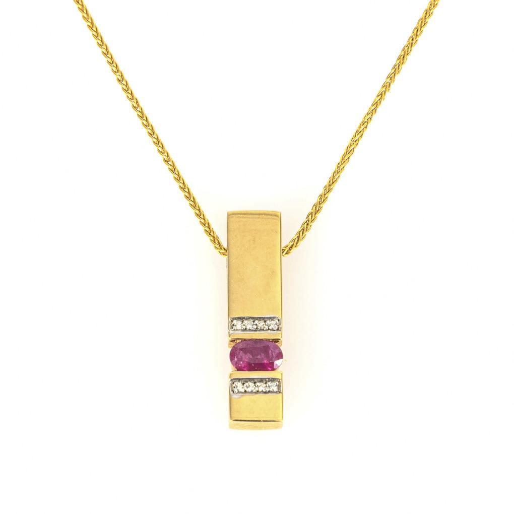 Massiver Stabanhänger mit gefasstem Rubin zwischen 4 eingelassenen Kleinstdiamanten. Zopfkette mit Karabinerschließe. Passend zu Kat-Nr. 186,187