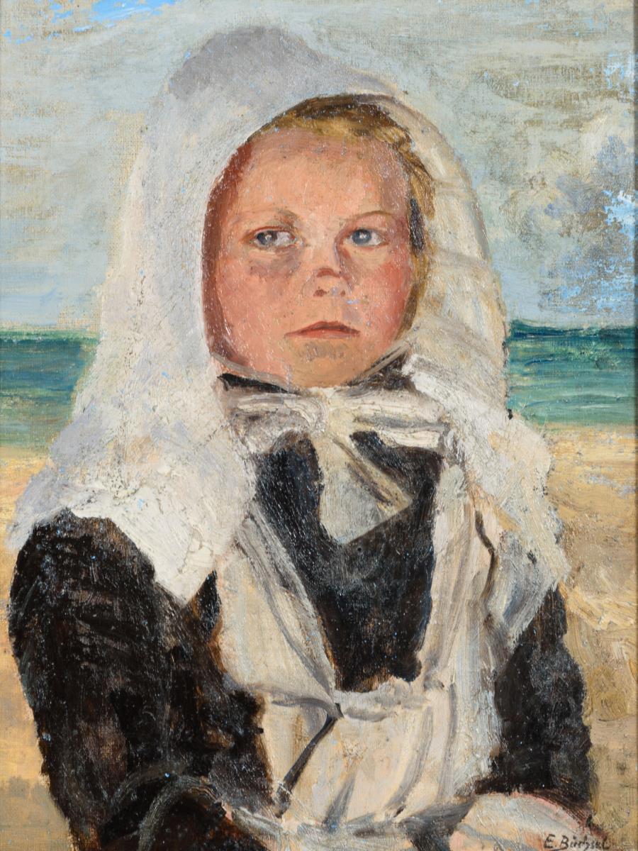 Mädchen mit weißer Haube und in schwarzem Kleid mit weißer Schürze am Strand. Im Himmel retuschiert.