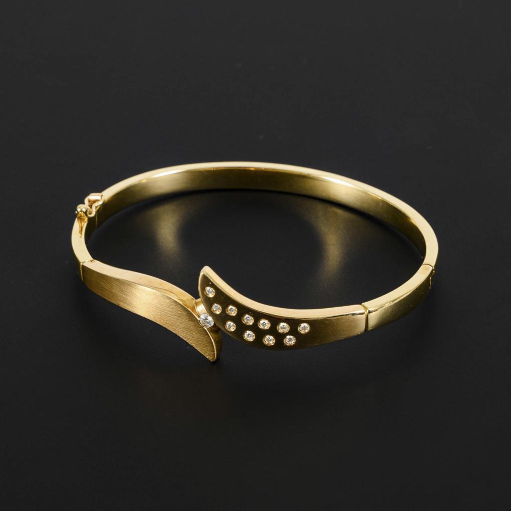 Ovaler Klappreif mit schauseitig 12 kleinen Brillanten. Kastenschloss mit Achtersicherung.