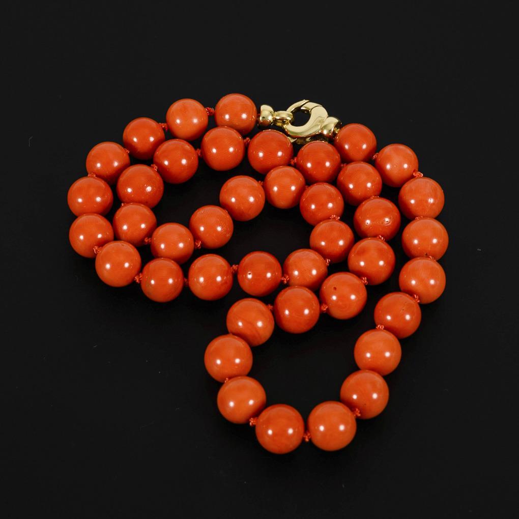 Gelbgoldschließe 585 gestempelt. Korallen Ø 1 cm. Kette L 46 cm. 56,1 g.