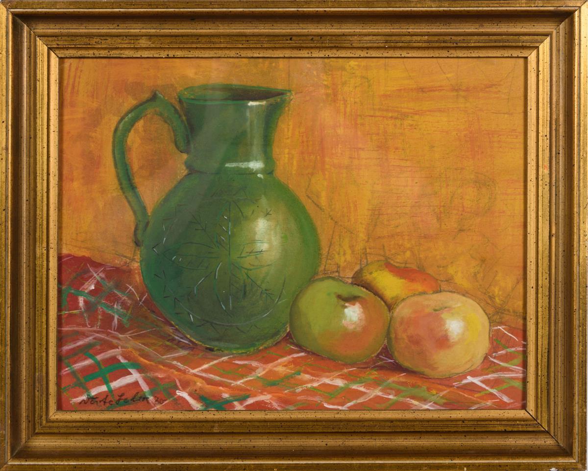 Drei Äpfel neben einer grünen Kanne auf kariertem Tuch.