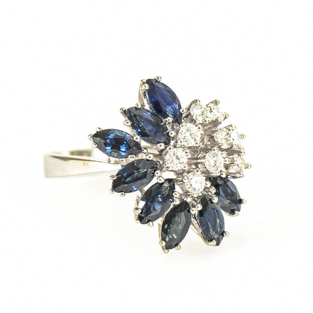 Weißgold 585 gestempelt. Saphire zus. ca. 2,00 ct. Brillanten zus. 0,63 ct gepunzt. Ringgröße 59. 6,4 g.