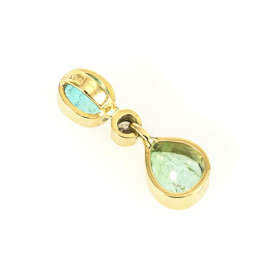 Gelbgold 585 gestempelt. Tumaline 1,297 ct/0,616 ct. Brillant 0,09 ct/Weiß/hohe Reinheit. Anhänger 2,2 x 0,8 cm. 3,0 g.