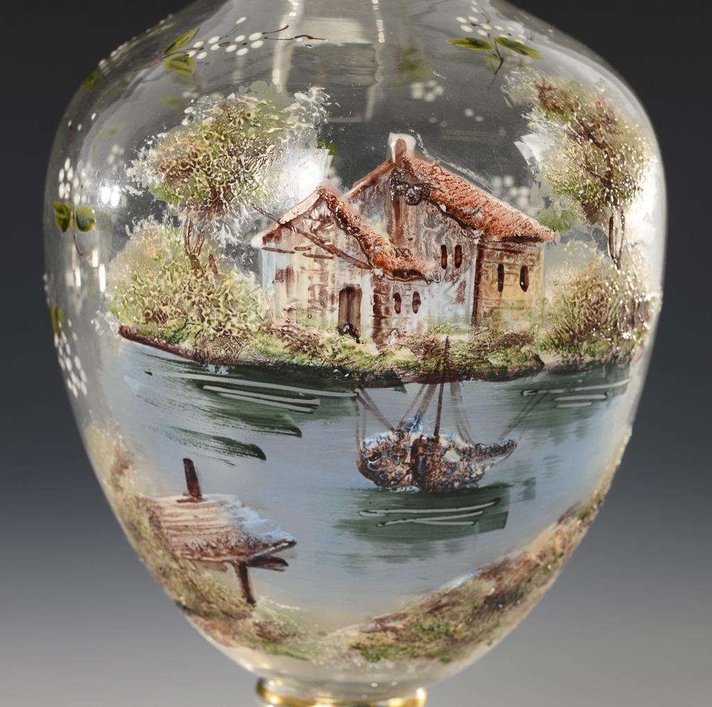 Karaffe und 4 Likörgläser mit Emailmalerei.