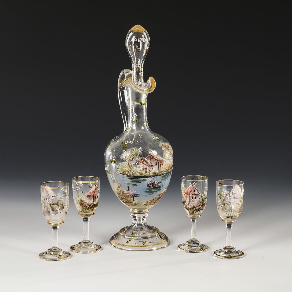 Farbloses Glas, polychrome Emailmalerei, Goldstaffage. Karaffe (H 29 cm), 4 Likörgläser (H 9,5 cm).