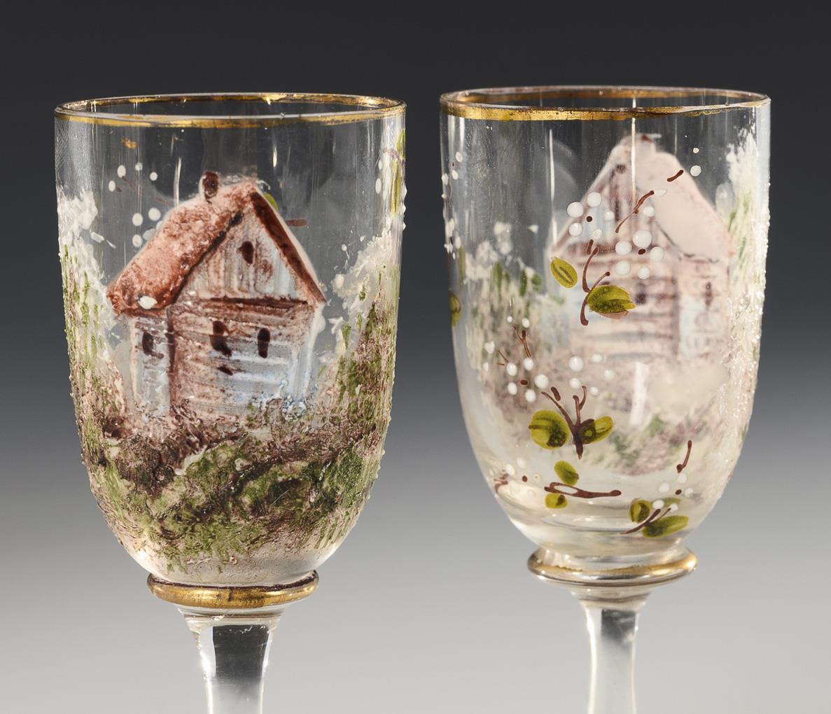 Ovoide, gefußte Karaffe mit Henkel und Stopfen sowie 4 kleine Kelchgläser. Bemalt mit Streublümchen und der schauseitigen Darstellung eines Hauses in einer Landschaft. Partiell minimaler Goldabrieb.