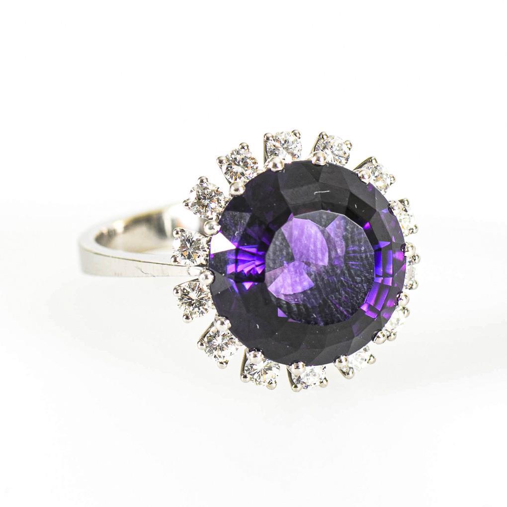 Weißgold 750 gestempelt. Amethyst Ø 13 mm. Ca. 7,00 ct. Brillanten zus. ca. 0,60 ct., hoher Farb-und Reinheitsgrad. Ringgröße 58. 6,9 g.