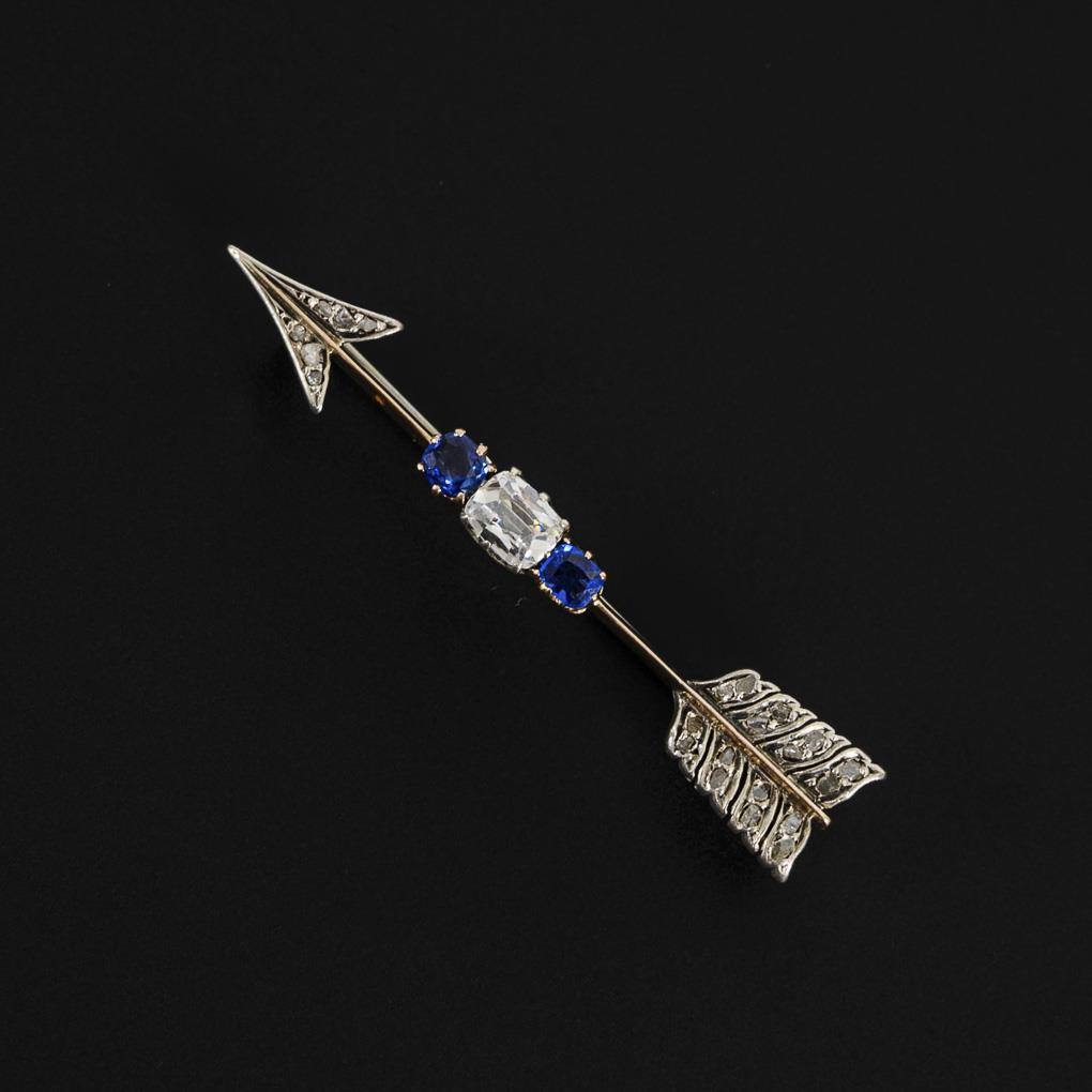 Sie befinden sich hier: Startseite Kategorien Schmuck Novelty-Brosche mit Altschliff-Diamant, Saphir, Farbstein und Altschliff-Diamanten, um 1890