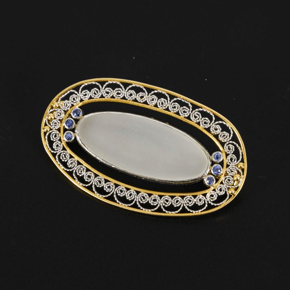 Zargengefasster, mattierter Bergkristallcabochon und 6 kleine Saphire in filigran- und granalienverziertem Rahmen. Kugelhaken.