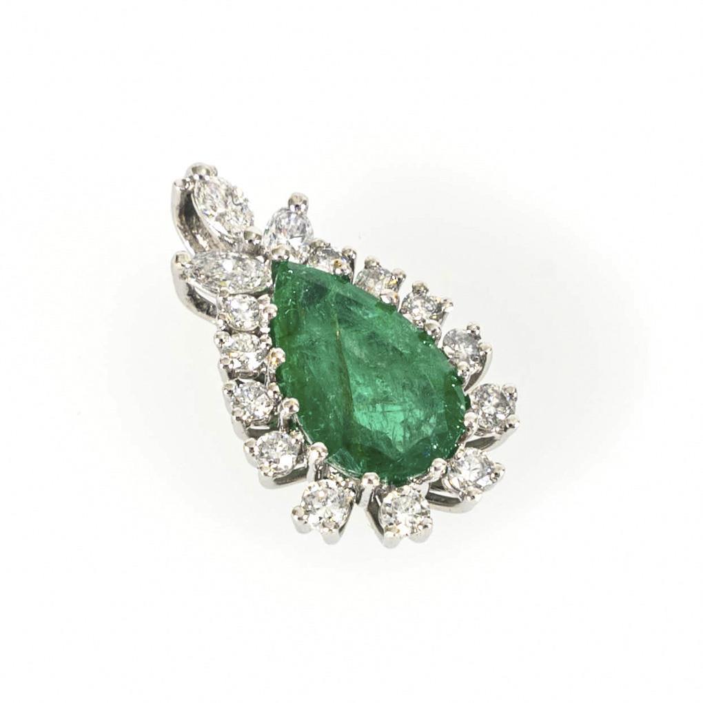 Weißgold 750 gestempelt. Smaragd ca. 10,7x6,5x3,5 mm. Ca. 1,20 ct. Brillanten und Diamanten zus. ca. 0,34 ct/Weiß/PI. Anhänger 1,8 x 1 cm. 2,2 g.