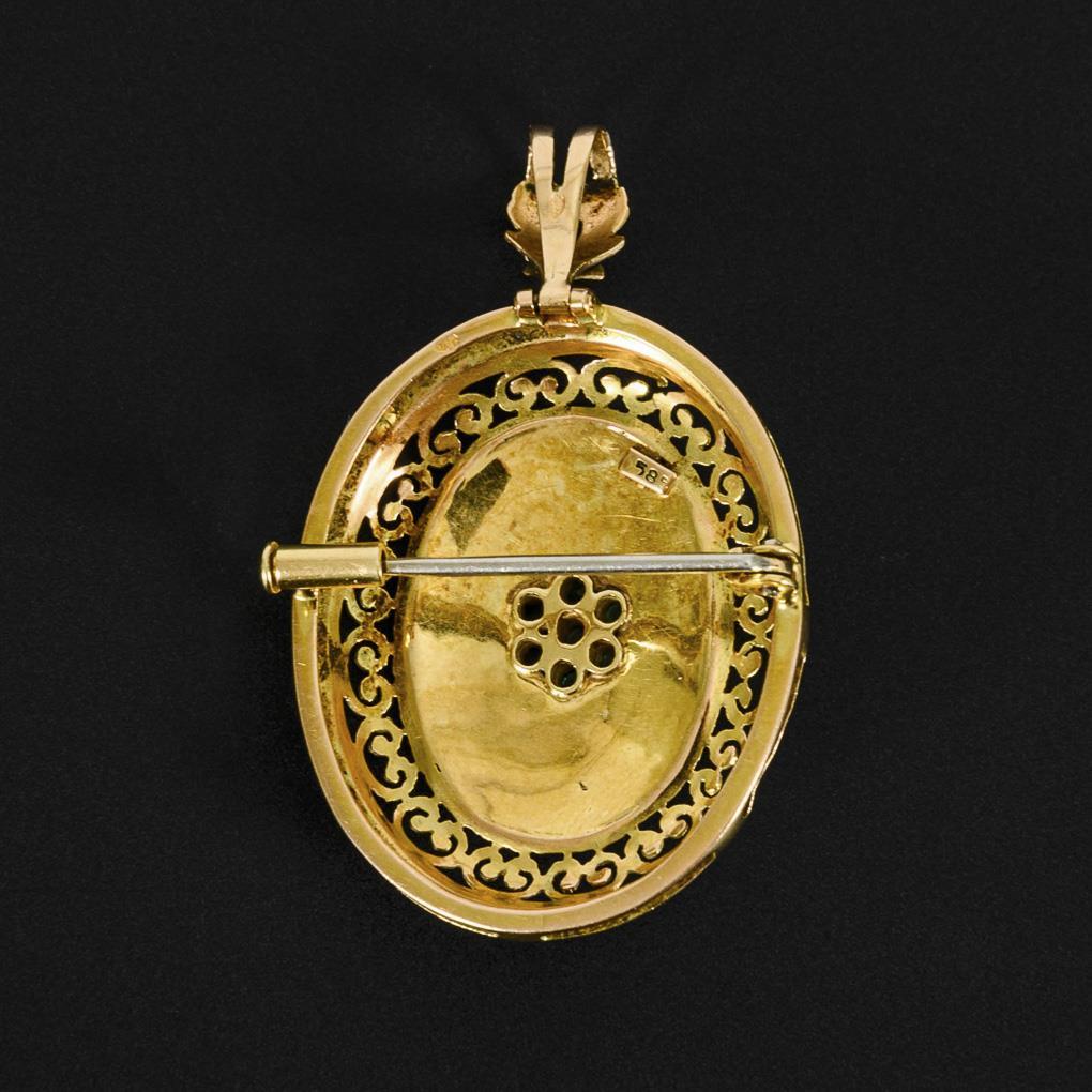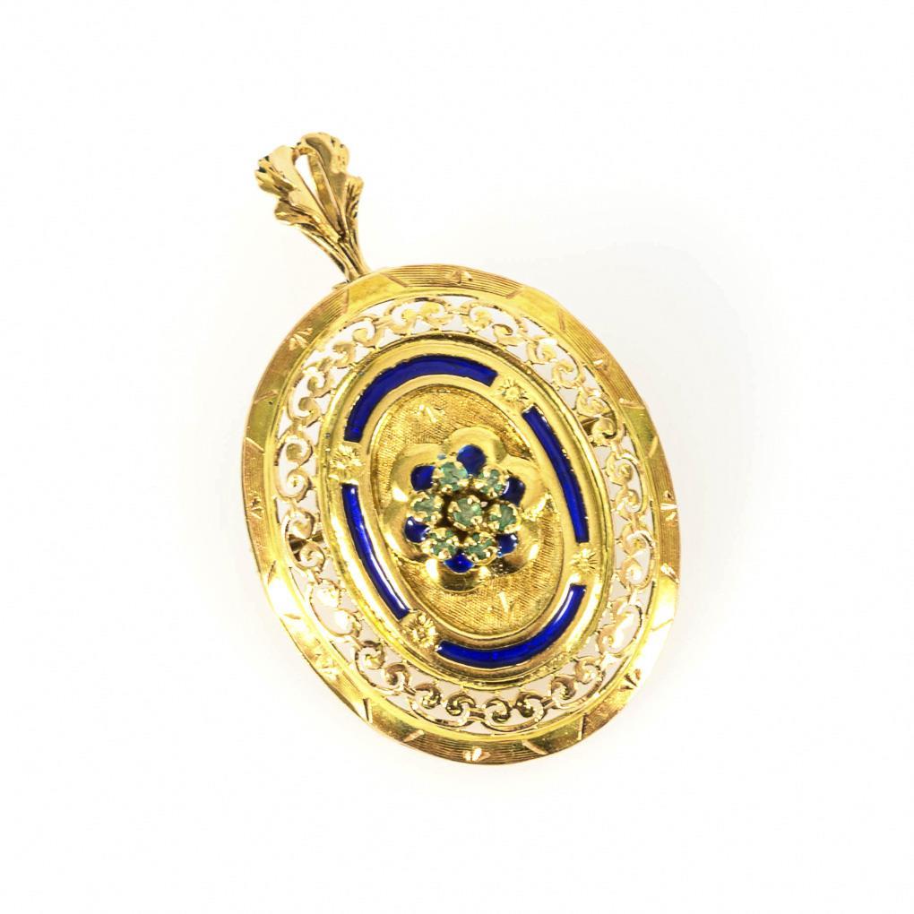 Anhänger/Brosche mit Smaragden und Email.