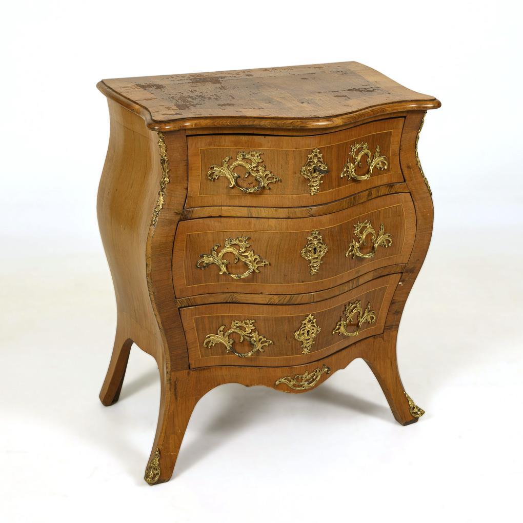 3-schübiger, bombierter Korpus mit geschwungener Zarge, auf leicht ausgestellten Füßen. Florale Bronzebeschläge. Einige Furnierschäden, Platte mit leicht offenen Leimfugen.