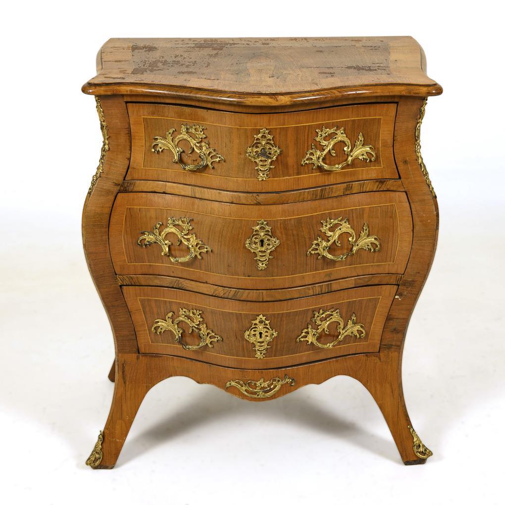 3-schübiger, bombierter Korpus mit geschwungener Zarge, auf leicht ausgestellten Füßen. Florale Bronzebeschläge. Einige Furnierschäden, Platte mit leicht offenen Leimfugen.