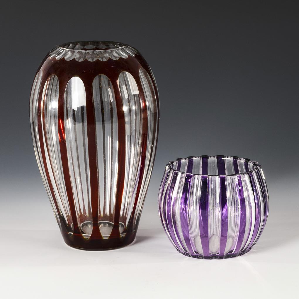 1x Haida?: Balustervase aus farblosem Glas mit gelbem Überfang, roter Beize sowie Linsen- und Schälschliffdekor (H 19 cm). / 1x wohl Val St. Lambert: bauchige Vase aus farblosem Glas mit amethystfarbenem Überfang und vertikal geschliffenen Streifen (H 8 cm).