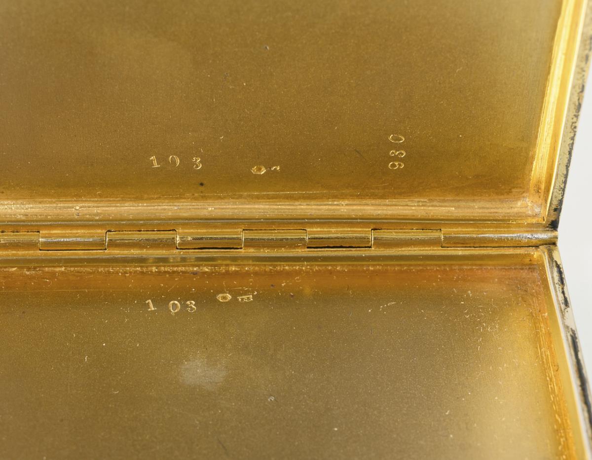Rechteckige Dose, auf dem Boden und auf dem Scharnierdeckel über konzentrischer Guilloche emailliert; auf dem Deckel zusätzlich dezent gerahmt und goldstaffiert.