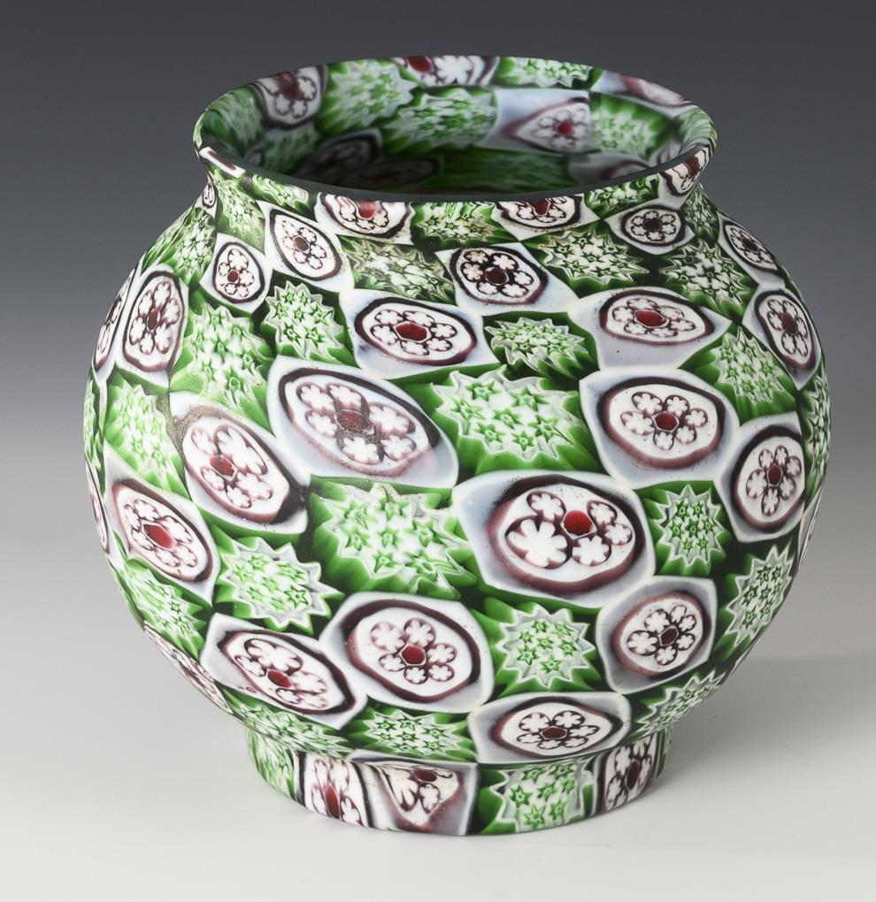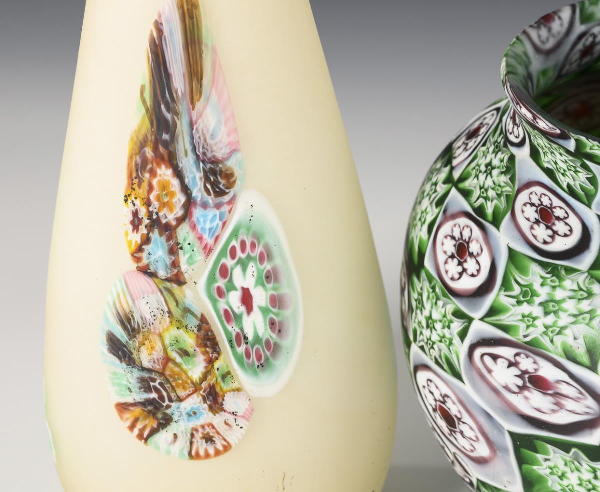 1x bauchige Vase aus farblosem, säuremattiertem Glas mit Murrinenaufschmelzungen in Grün, Opalweiß und Rot (H 14 cm). / 1x tropfenförmige Vase aus farblosem Glas mit weißem Innenfang, eingeschmolzenem Goldflitter und aufgeschmolzenen Murrinen (H 25,5 cm).