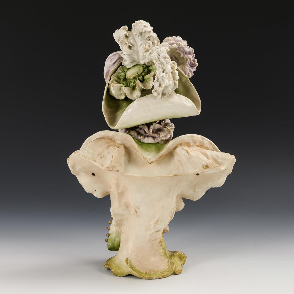 Büste einer jungen Dame mit federgeschmücktem Dreispitz und aufwändig gearbeitetem Kleid mit Volantbesatz. Goldperlen der Schleifenbänder teils restauriert, wenige, teils goldretuschierte Kantenbestoßungen.