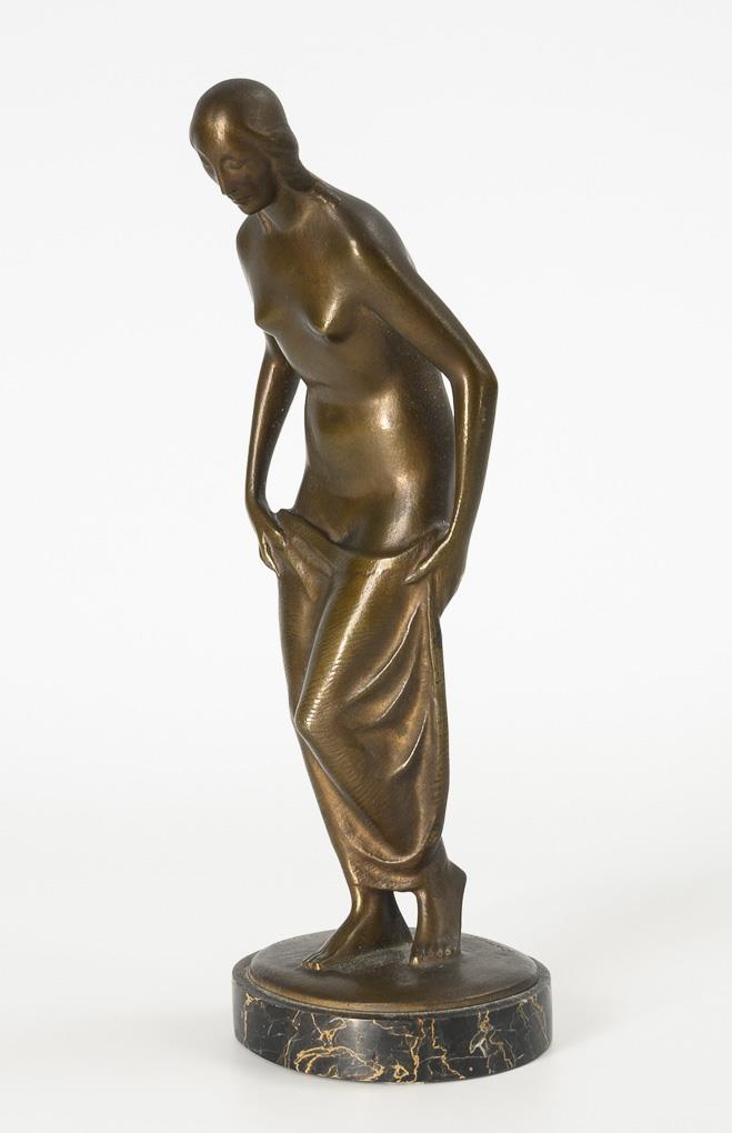 Stehender Frauenakt mit herabgelassenem Tuch.