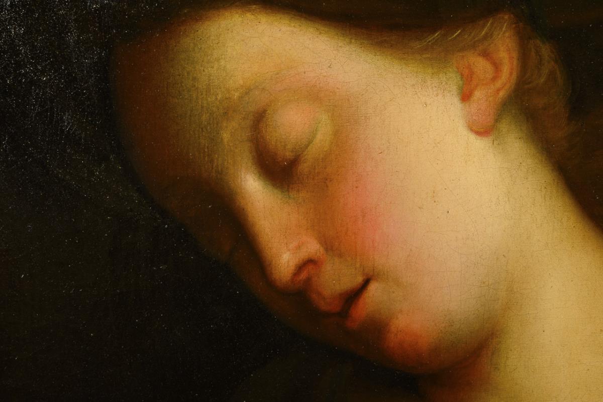 Bildnis einer schlafenden jungen Frau mit Turban auf einem Sitzmöbel. Altersspuren.