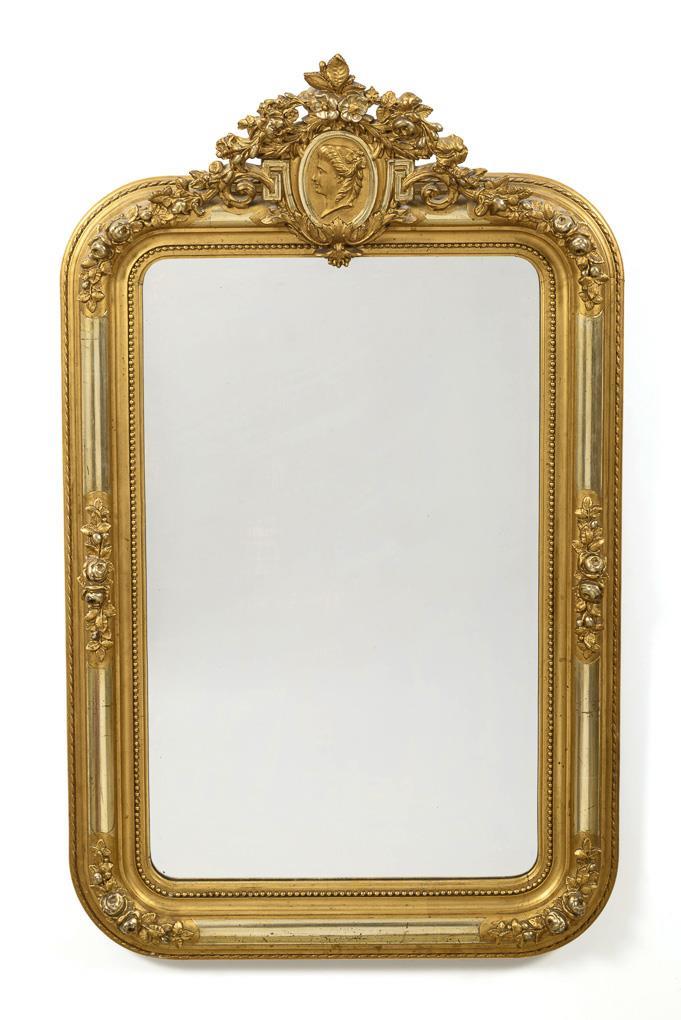 Hochrechteckiger Wandspiegel mit gerundeten Ecken und Profilrahmen mit Reliefblumen und Perlschnur, Bekrönung durch ein blumengeschmücktes Ovalmedaillon mit Frauenkopf im Profil, jünger ergänztes Spiegelglas. Alters- und Gebrauchsspuren, partiell kleine Defekte.