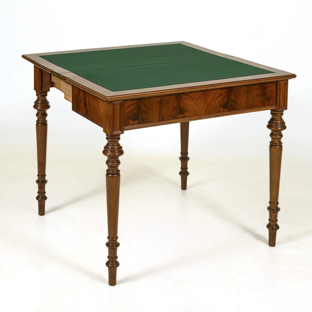 Klappbare, viertelfurnierte Deckplatte mit profilierter Kante und innen grünem Filzbelag, ausziebarer Zargenkasten, auf 4 konischen Drechselbeinen. Messingscharniere.