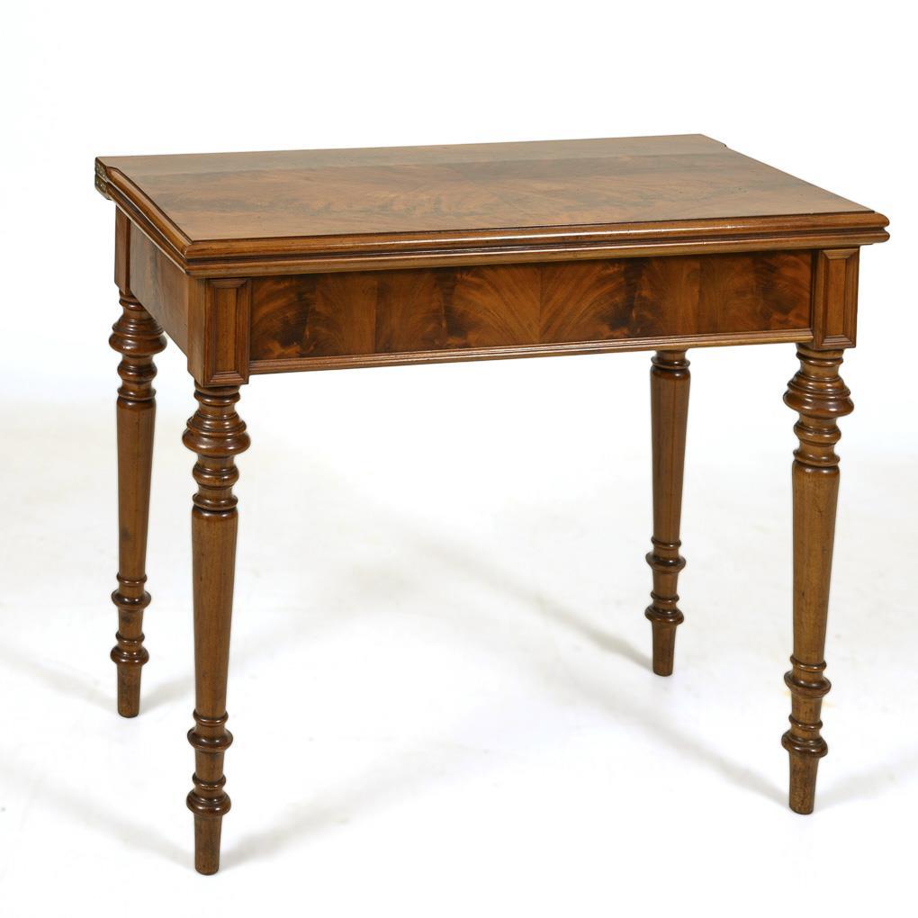 Klappbare, viertelfurnierte Deckplatte mit profilierter Kante und innen grünem Filzbelag, ausziebarer Zargenkasten, auf 4 konischen Drechselbeinen. Messingscharniere.