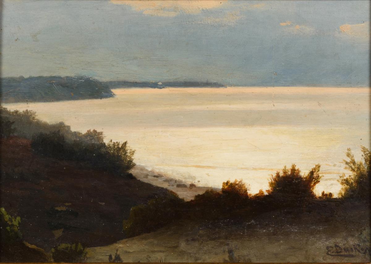 Das helle Licht spiegelnde Wasser im Kontrast zur Küste. Retuschiert, wenige Altersspuren.