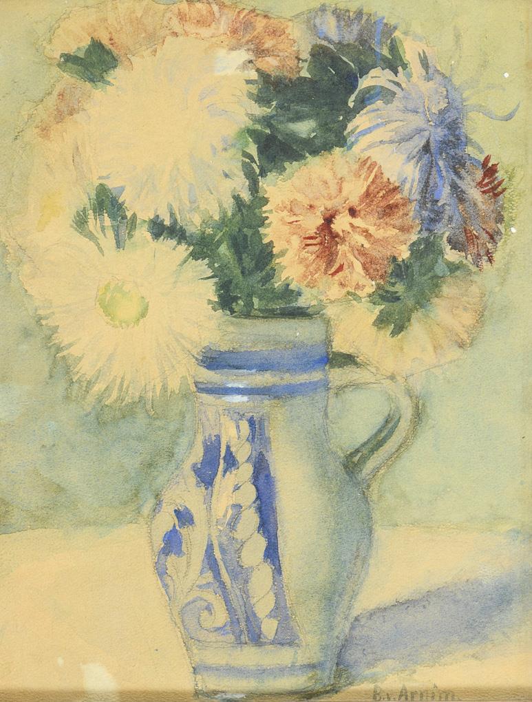 Verschiedenfarbige Blumen in einer Keramikkanne im hellen Licht. Anbei Sammelband Böhland, D./Schremmer, M. (Hgg.): "Die Malerei ist mein ganzes Glück". Bettina Encke von Arnim - Leben und Werk 1895 - 1971. Berlin 2015.
