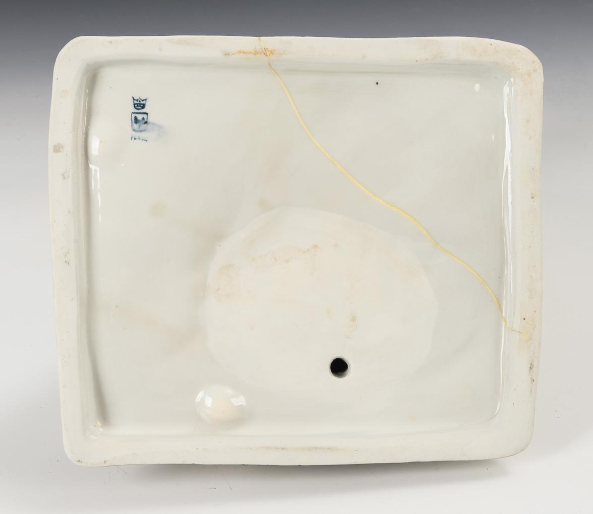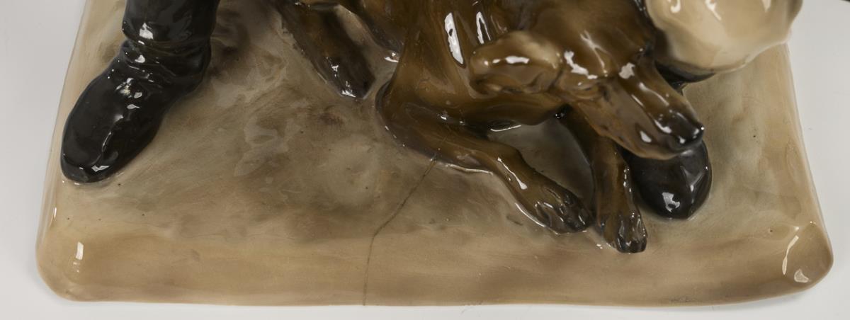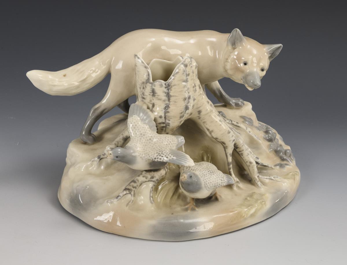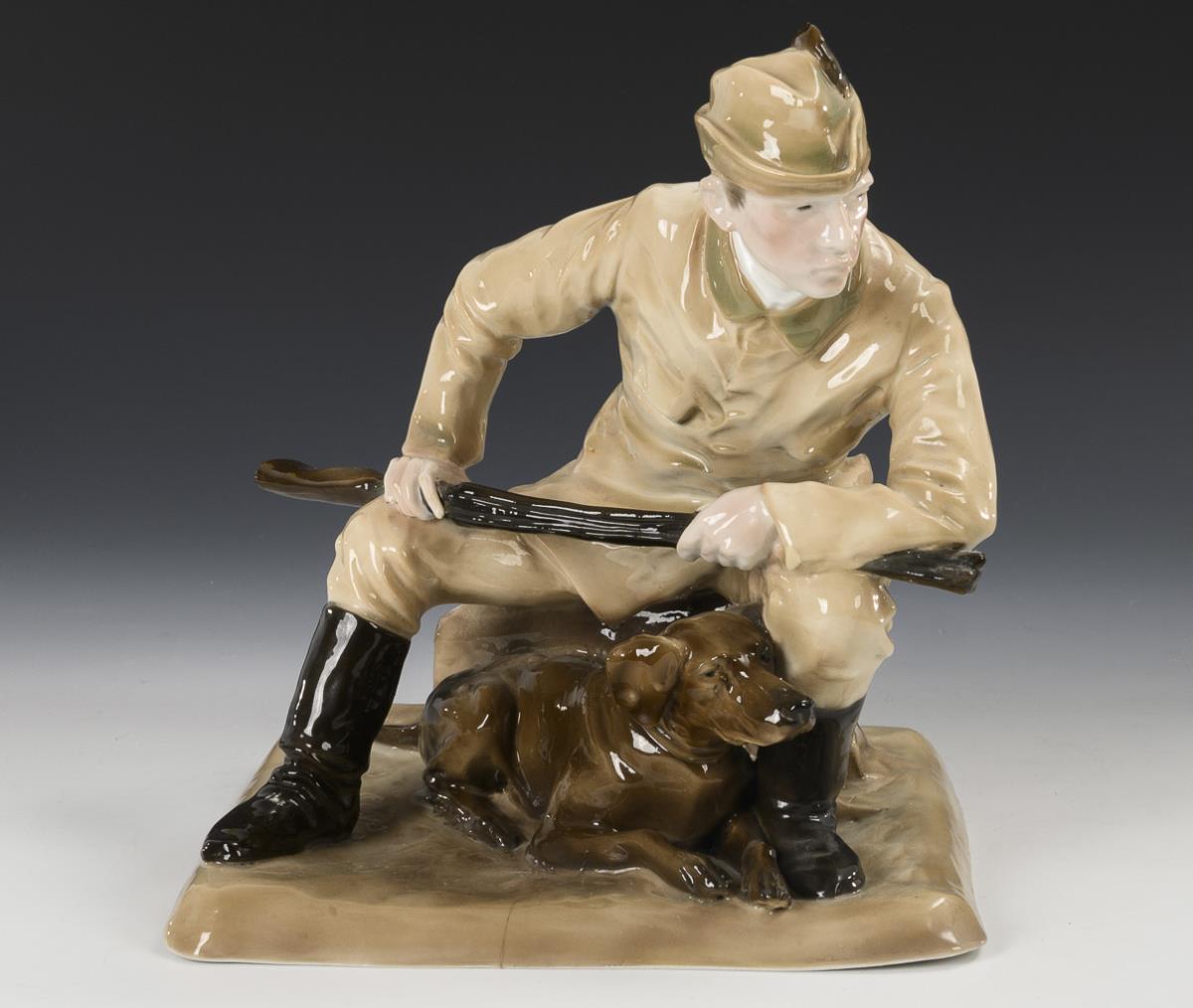 1x Entwurf von Wera von Bartels (1886-1922), signiert: auf einem Baumstumpf sitzender Jäger mit Hund und Flinte (H 24 cm). / 1x Modell-Nr. 309, auf einem Natursockel laufender Fuchs mit zwei Rebhühnern und einem Baumstamm als Vase (H 12,5 cm). 2 Haarrisse im Sockel des Jägers, verso kleine Sockelbestoßung, 1 Rebhuhnschnabel bestoßen.