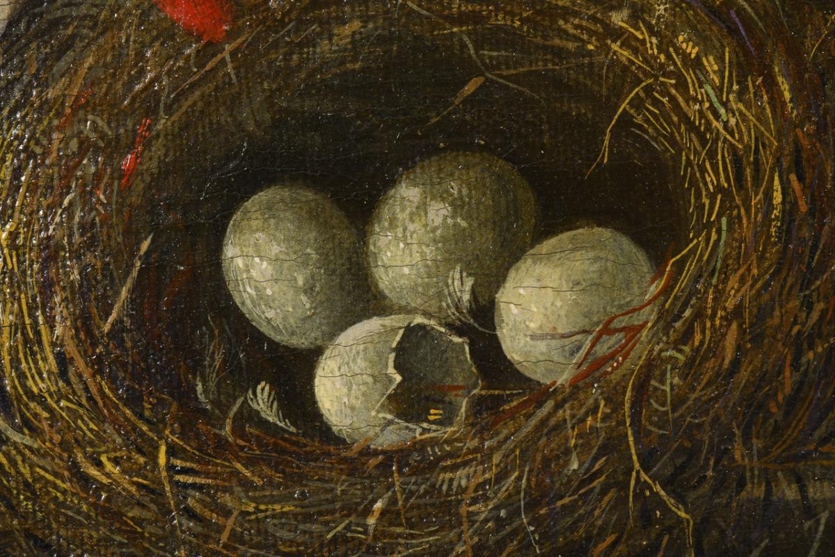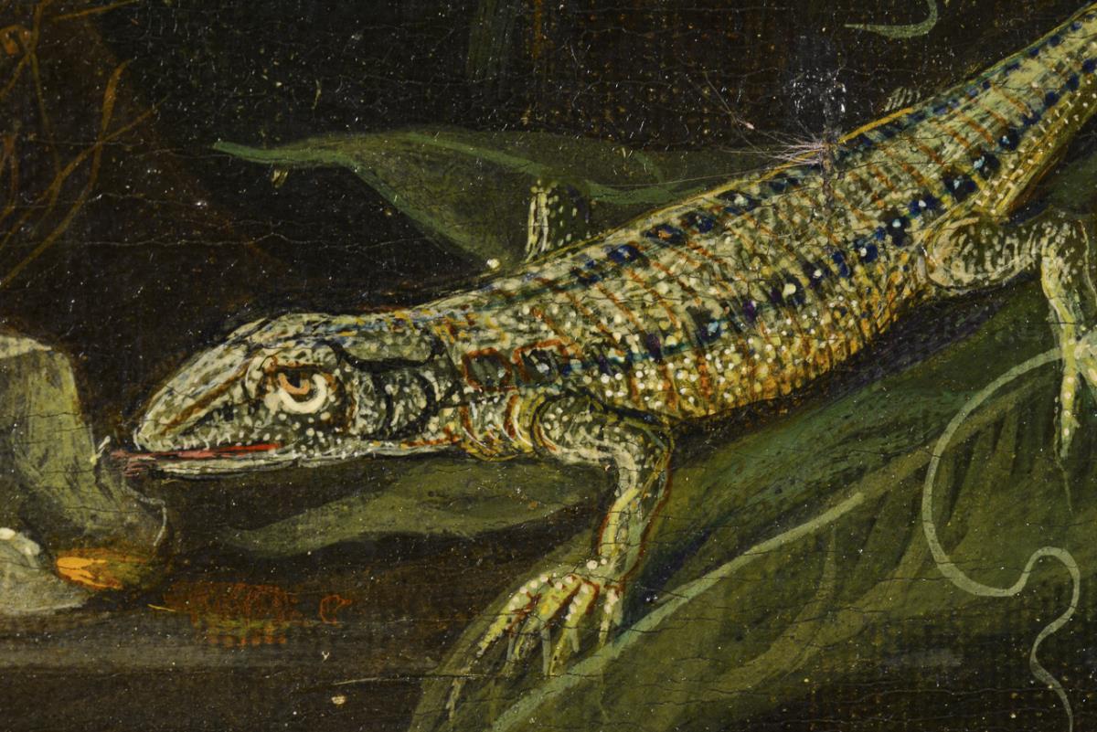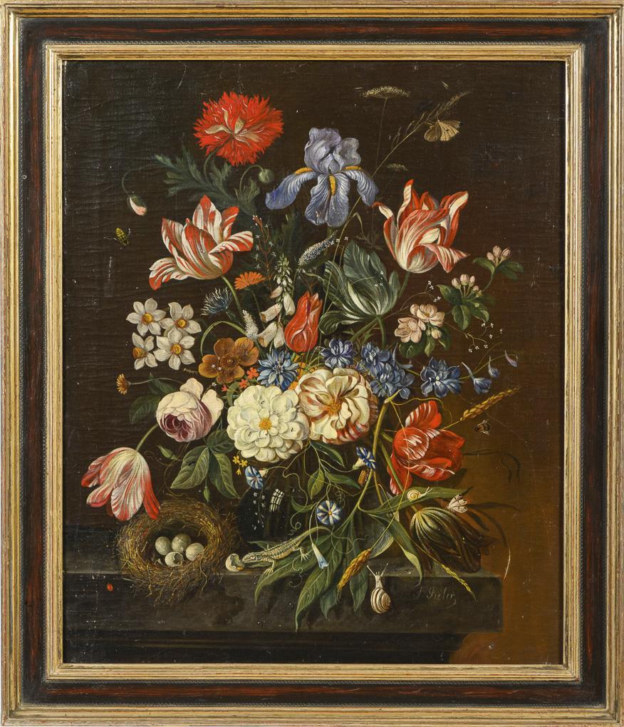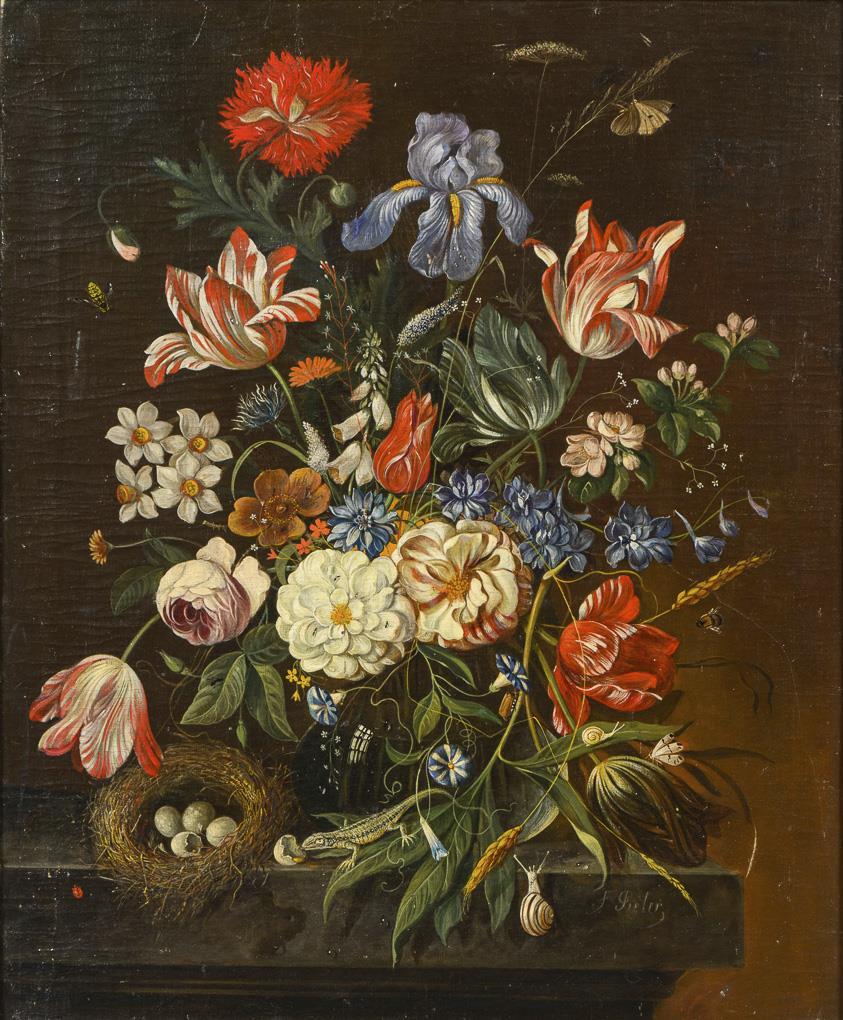 Altmeisterlich gemalte Tulpen, Rosen, Mohn und andere Blumen in einer Glasvase neben einem Nest mit Vogeleiern, an denen sich gerade eine Echse gütlich tut, während allerlei Insekten und eine Schnecke sich dem Strauß zuwenden. Altersspuren.