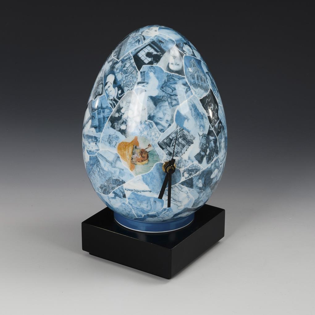 Uhr in Ei-Form mit zwei batteriebetriebenen Uhrwerken, auf Holzsockel. Auf der Wandung das polychrome Dekor von in Art einer Collage angeordneten Bildausschnitten von Kunstwerken. Im Boden des Holzsockels eine Porzellanplakette mit Manufakturmarke und der Bezeichnung "Porzellanobjekt 'Artis timpi' (sic!) / Jiri Kolar 50/ Künstlerexemplar". Uhren laufen. Zeiger teils minimal verbogen.