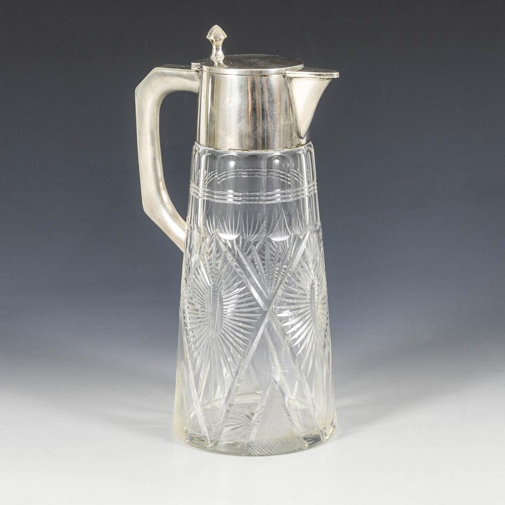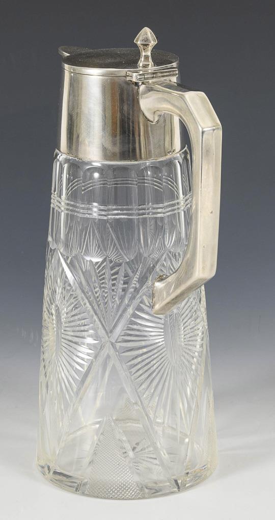 Reich beschliffener, konischer Krug mit glatter Silbermontierung und Scharnierdeckel. Wenige winzige Bestoßungen am Schliffdekor.