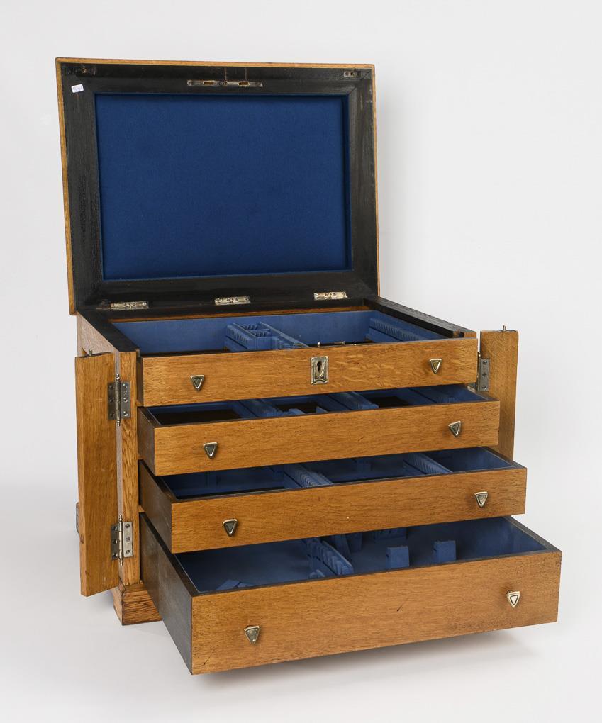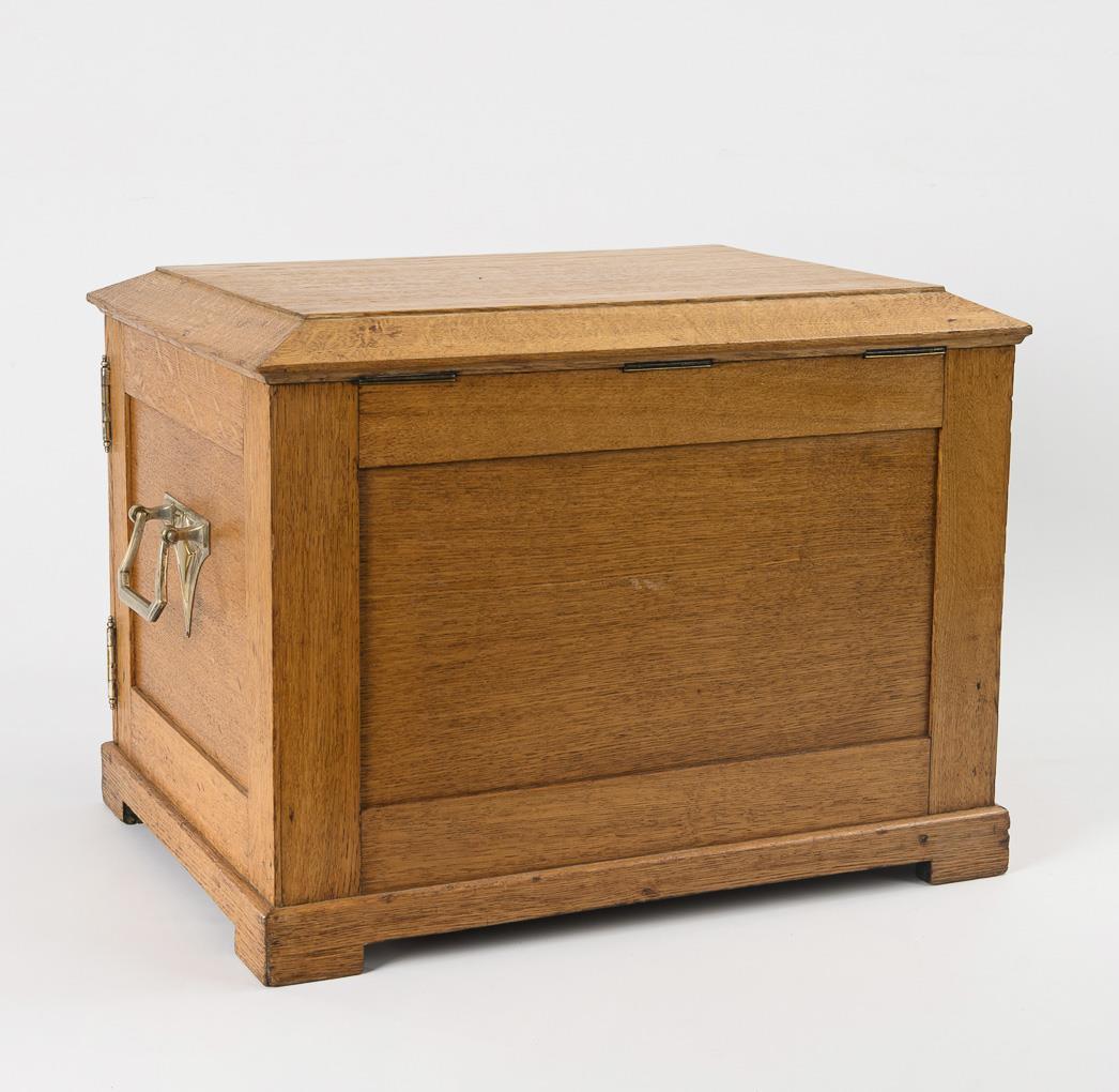 Eiche massiv, Messingbeschläge mit silberfarbenem Überzug, Originaleinsätze mit blauem Stoff. 42 x 56 x 42 cm. 15,7 kg.