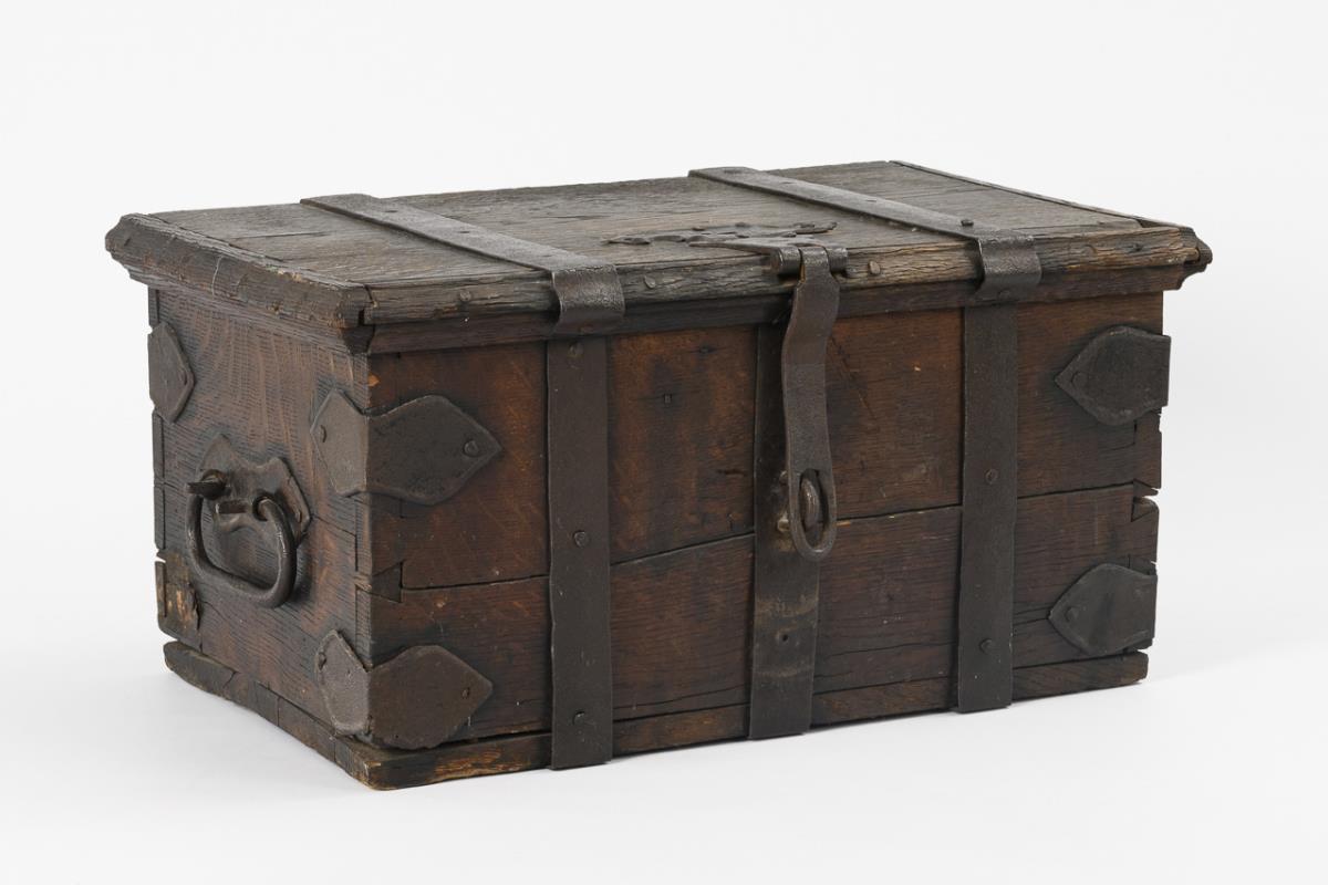 Quadertruhe mit Überfallbügel für ein Vorhängeschloss und Schlüsselloch auf dem Scharnierdeckel. Eisenbänder und blattförmige Übereckbeschläge sowie seitlich Tragegriffe. Einige Trockenrisse und Fehlstellen, Schloss fehlt.
