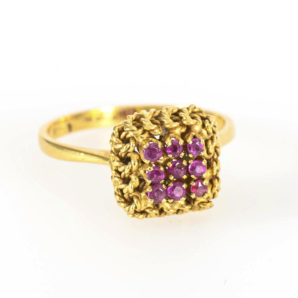 9 kleine, auf gekordeltem Ringkopf chatongefasste Rubine zwischen schmaler Schiene.