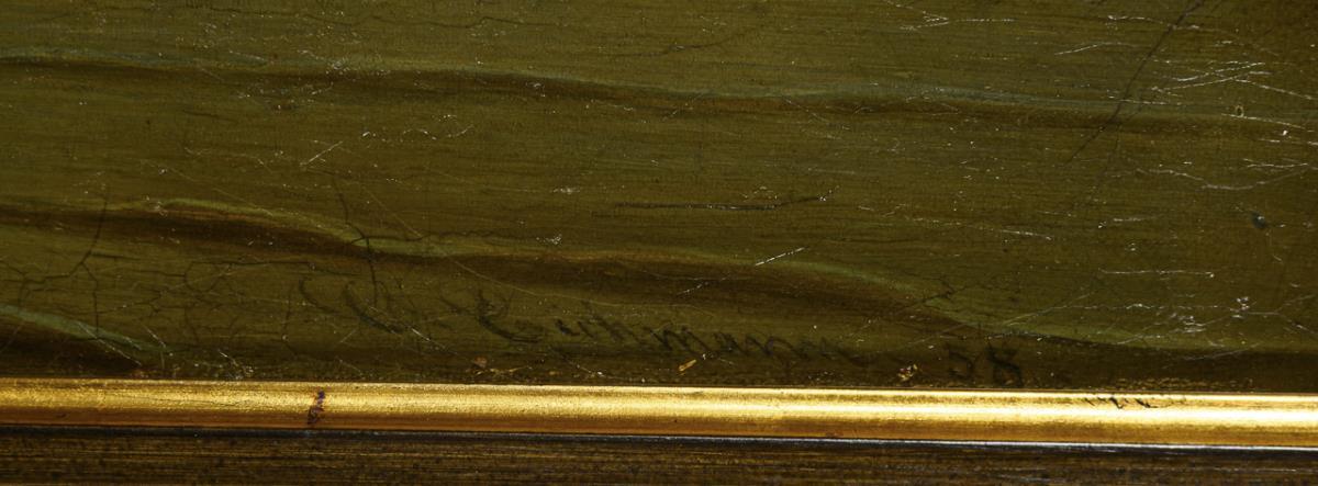 Öl/Leinwand. Rechts unten signiert, verso bezeichnet und undeutlich betitelt. (18)58.
