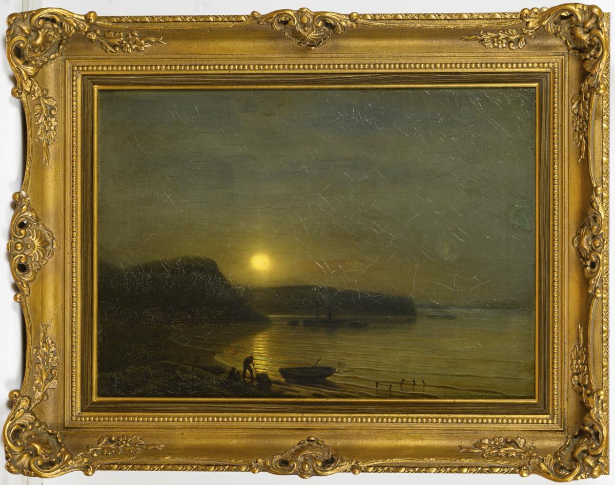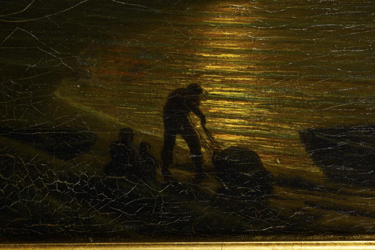 Im stimmungsvollen Licht des aufgehenden Vollmondes arbeitende Fischer an der Küste mit weiteren Booten. Zwei kleine restaurierte Stellen.