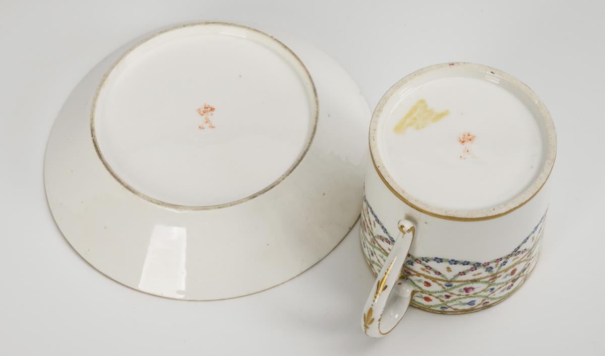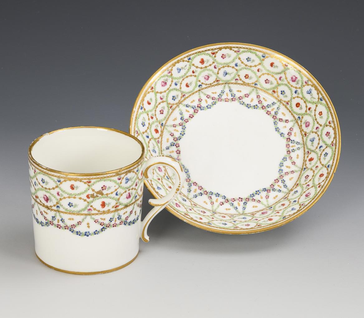 Zylindertasse mit Ohrenhenkel. Auf der Wandung über sich überschneidenen Blütenfestons Streublümchen in grünen und goldenen Blattranken. Geklebter Randchip an der Tasse, Haarriss am Untertassenrand, partieller Goldabrieb.