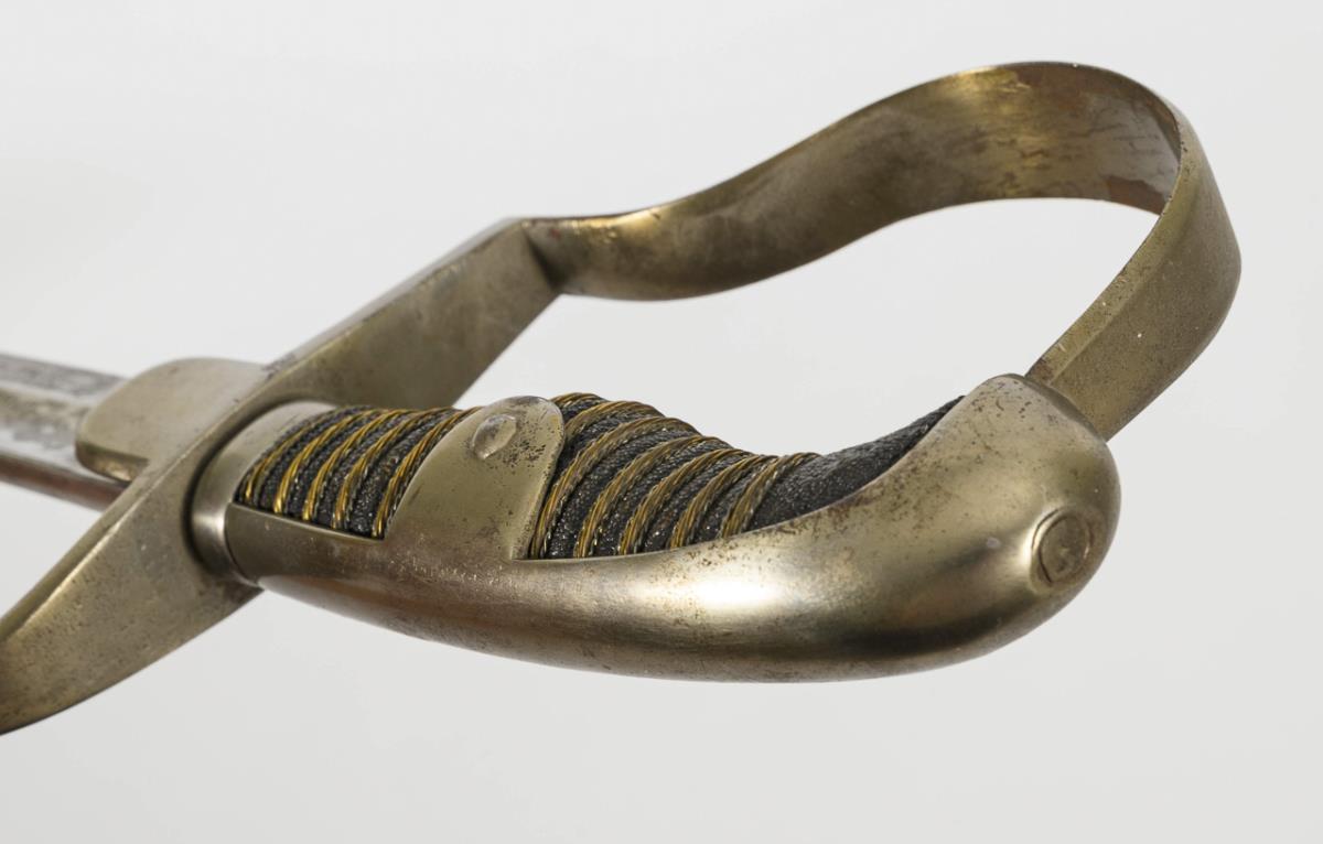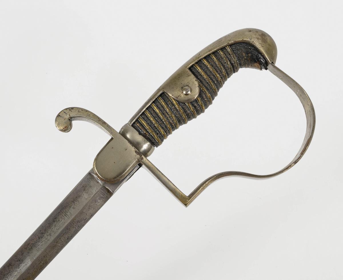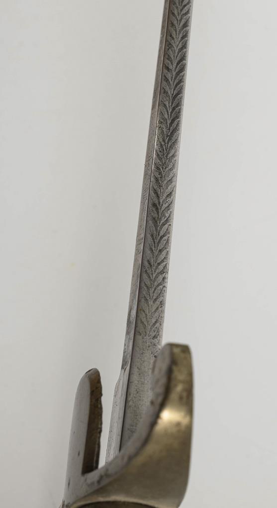 Wenig gekrümmte, einschneidige Klinge mit Ätzmuster. Eisengefäß, Fischhautgriff mit Drahtwicklung, kleine Fehlstelle. Schwarze Metallscheide mit einem Ring.