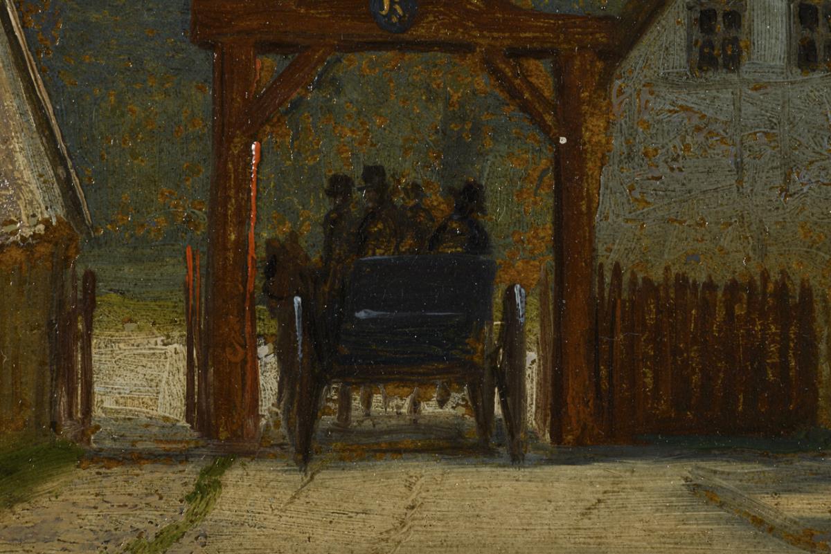 Dorfstraße mit Kutsche bei der Ausfahrt aus dem Ort an einem sonnigen Tag. Leichte Altersspuren.